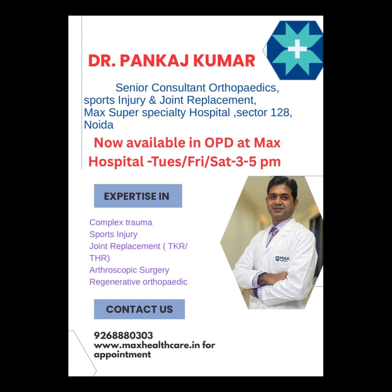 Dr. Pankaj Kumar, senior consultant Orthopaedics and sports injury, joint replacement is now available at MAX SUPER SPECIALITY HOSPITAL, sector 128, Noida(Formerly known as Jaypee Hospital) for OPD consultation on TUESDAY/FRIDAY/SATURDAY FROM 3-5 PM.